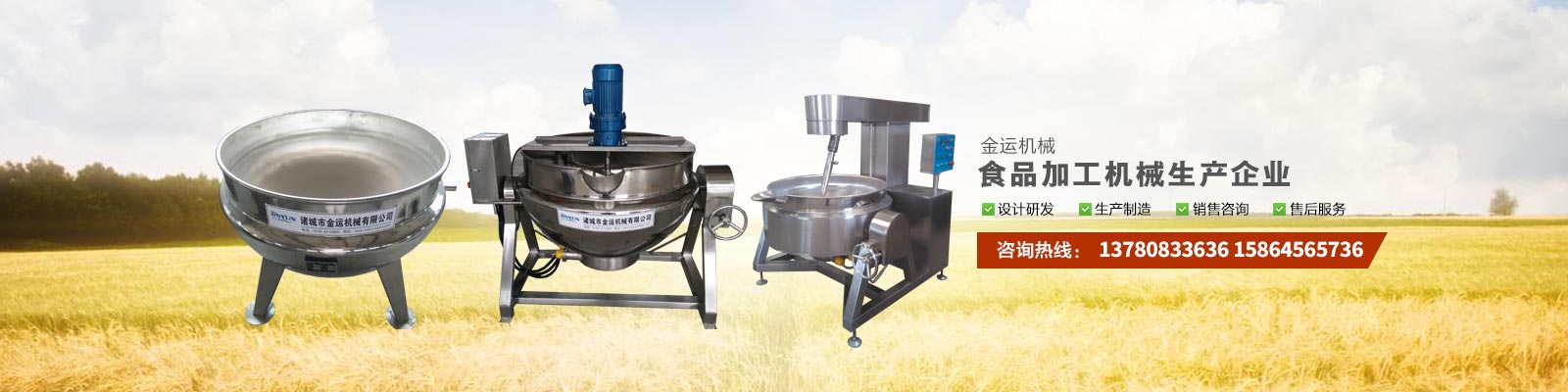 主要產(chǎn)品有:行星攪拌夾層鍋、夾層鍋、壓力煮鍋、各種餡料炒鍋、殺菌鍋(殺菌釜)、巴氏殺菌機、清洗流水線、風干線、真空包裝機、滾揉機、斬拌機、鹽水注射機、大蒜脫皮機、大蒜分瓣機等,廣泛應用于各種食品加工、食品殺菌及農(nóng)產(chǎn)品深加工、化工、醫(yī)藥的生產(chǎn)等。可滿足外資企業(yè)、合資企業(yè)及國內(nèi)大中小企業(yè)生產(chǎn)需求,產(chǎn)品暢銷全國各地。